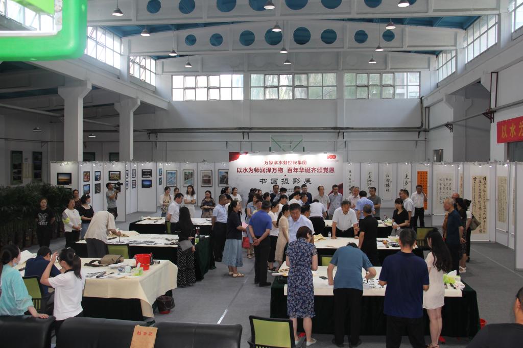 場地周邊豎立的展板上懸掛著集團職工創作的70余幅書法、繪畫、攝影作品,內容包括黨建金句、集團企業文化相關內容、水利工程形象等。書畫家們參觀職工作品,進行點評并投票。