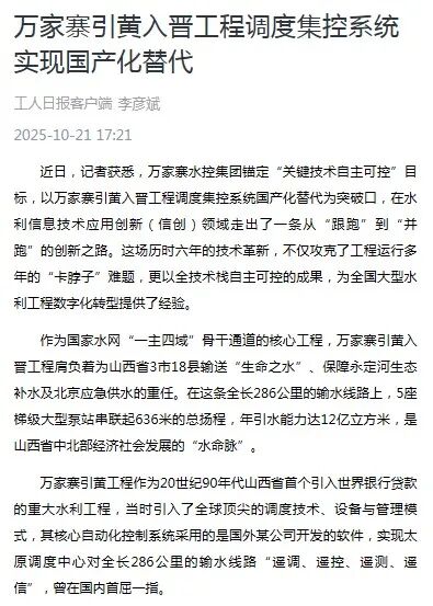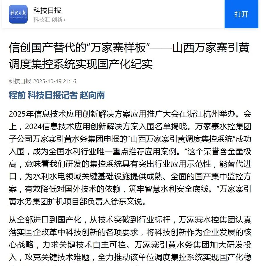 2025年信息技術(shù)應(yīng)用創(chuàng)新解決方案應(yīng)用推廣大會(huì)在浙江杭州舉辦。會(huì)上,2024信息技術(shù)應(yīng)用創(chuàng)新解決方案入圍名單揭曉。萬家寨水控集團(tuán)子公司萬家寨引黃水務(wù)集團(tuán)申報(bào)的“山西萬家寨引黃調(diào)度集控系統(tǒng)”成功入圍,成為全國水利行業(yè)唯一重點(diǎn)推薦應(yīng)用案例。“這個(gè)榮譽(yù)含金量極高,意味著我們研發(fā)的集控系統(tǒng)具有突出行業(yè)應(yīng)用示范性,能替代進(jìn)口,為水利水電領(lǐng)域關(guān)鍵基礎(chǔ)設(shè)施提供成熟、全面的國產(chǎn)集中監(jiān)控方案,有效降低對(duì)國外技術(shù)的依賴,筑牢智慧水利安全底線。”萬家寨引黃水務(wù)集團(tuán)擴(kuò)機(jī)項(xiàng)目部負(fù)責(zé)人徐東文說。