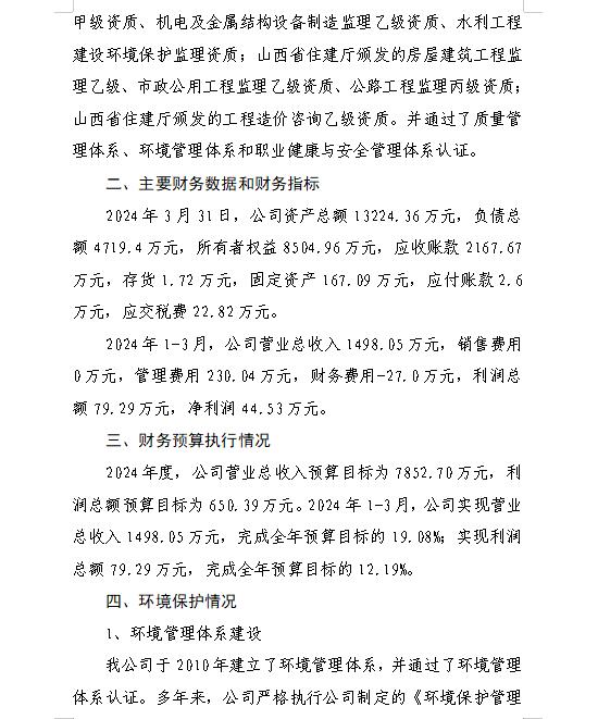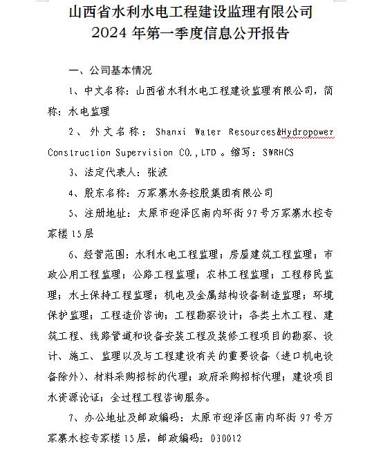 山西萬(wàn)家寨水控工程投資有限公司2024年第一季度信...