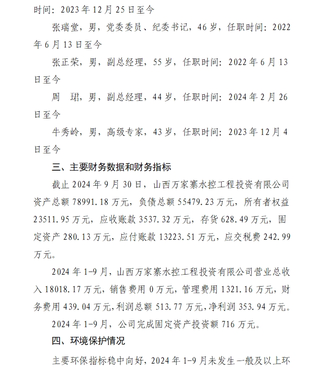 山西萬家寨引黃水務集團有限公司2024年第三季度信...