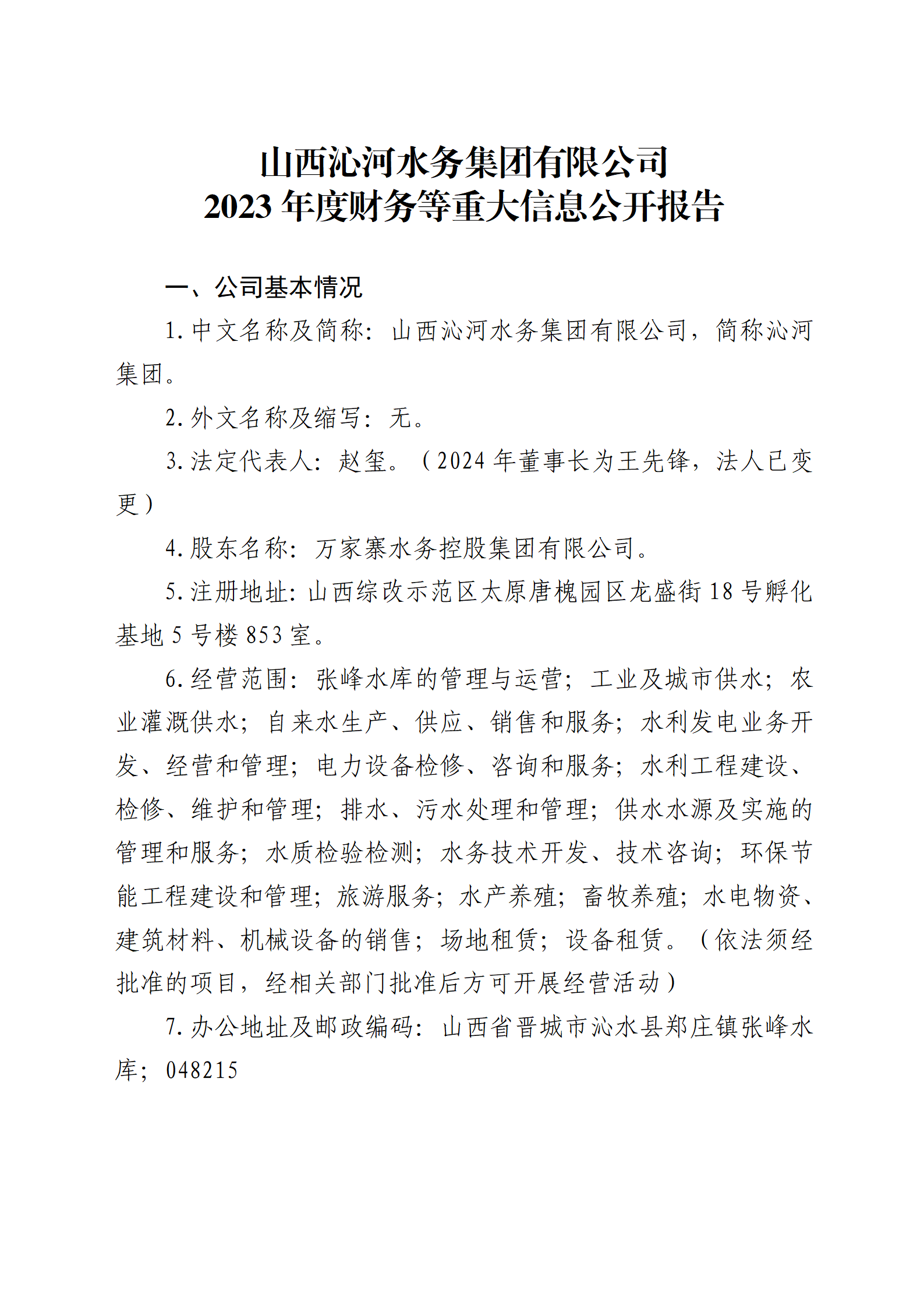 山西水投汾景水務(wù)有限公司2024年中期信息公開報告