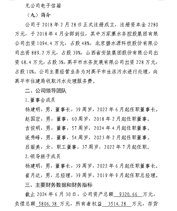 山西水投碧源水處理有限公司2024年第三季度信息公...